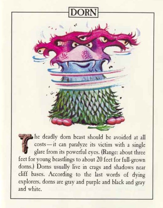 You are about to be eaten by a grue. > frotz the grue. There is a blinding flash of light, which gradually subsides, but the grue is now quite usable as a light source. The grue shrieks in terror and runs around in circles, trying to find darkness. > learn zifnia and vaxum and nitfol and cleesh. Using your best study habits, you commit the zifnia spell to memory. Using your best study habits, you commit the vaxum spell to memory. Using your best study habits, you commit the nitfol spell to memory. Using your best study habits, you commit the cleesh spell to memory. > zifnia a dorn. Suddenly, a dorn beast appears beside you out of thin air. The dorn beast is momentarily too surprised to act. The grue shrieks in terror and runs around in circles, trying to find darkness. > vaxum the dorn. The dorn beast looks at you and smiles. The grue shrieks in terror and runs around in circles, trying to find darkness. > nitfol the dorn. The dorn beast looks at you. "Hello", it says. The grue shrieks in terror and runs around in circles, trying to find darkness. > dorn, kill the grue. The dorn beast tramples the grue to death. > cleesh the dorn. The dorn beast suddenly changes into a small orange newt, which crawls away.
