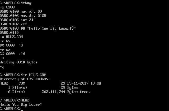 HAHA, awesome!!! You should look into doing something with batari. That assembler program reminds me of another time that I wrote a quick little TSR that would randomly pop a message on the screen then hide it. Then call that in the autoexec.bat, move that autoexec and bury it in a subfolder somewhere, then sector edit the command.com to look at the alternate autoexec.bat...