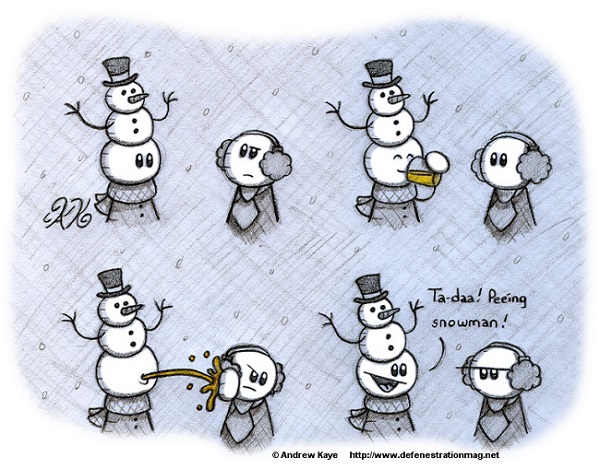 President Clinton wakes up to a beautiful winter morning at the snow-covered White House lawn and sees the words "President Clinton sucks" written in pee in the snow.